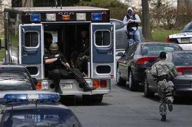 Police and SWAT teams assemble on the Virginia Tech campus in Blacksburg, Va., Monday, April 16, 2007. [AP]