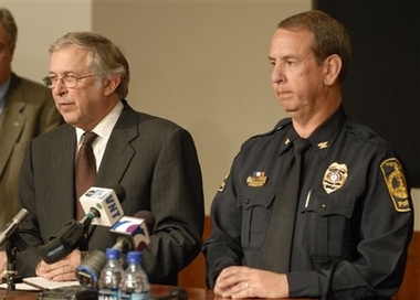 Virginia Tech President Charles Steger, left, and Virginia Tech Chief of Campus Police W.R. Flinchum listen at a news conference on the campus of Virginia Tech, where Steger announced the shooting deaths of 32 people in Blacksburg, Va., Monday, April 16, 2007[AP]