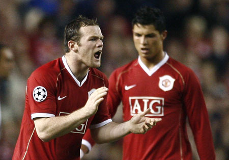 Manchester United's Wayne Rooney (L) gestures as Cristiano Ronaldo watches during their Champions League semi-final first leg soccer match against AC Milan in Manchester April 24, 2007.[Reuters]