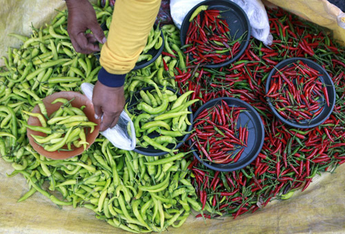 An elderly street vendor sorts chillies at a large wet market in Quezon City, Metro Manila April 25, 2007. [Reuters]
