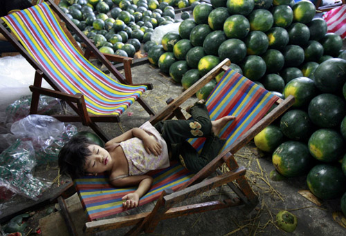 A girl sleeps near watermelons for sale at a large wet market in Quezon City, Metro Manila April 25, 2007. [Reuters]