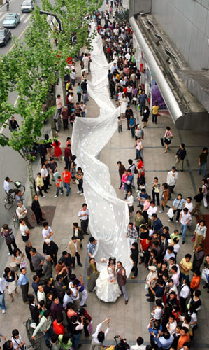 Local residents rush to catch a sight as Miss Taiwan Xu Surong walks down North Sichuan Road in a 100-meter-long wedding gown during a wedding culture exhibition in east China's Shanghai, May 5, 2007. [newsphoto]