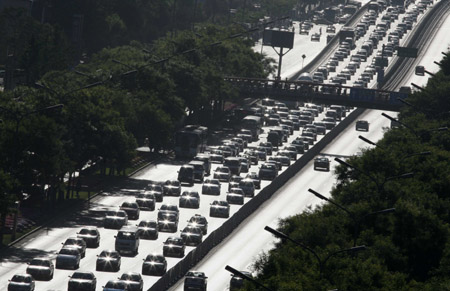 Rows of vehicles are seen at the east section of Chang'an street in Beijing May 14, 2007. China's annual consumer inflation slowed a touch in April to 3.0 percent from a more than two-year high of 3.3 percent in March, but analysts said the result would reinforce the case for further monetary tightening measures. [Reuters]