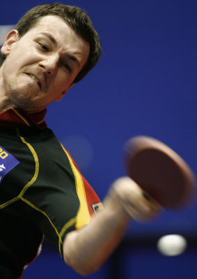 Timo Boll of Germany returns a forehand against Ju Lin of Dominican Republic during their men's singles match at the World table tennis championships in Zagreb May 24, 2007. [Reuters]