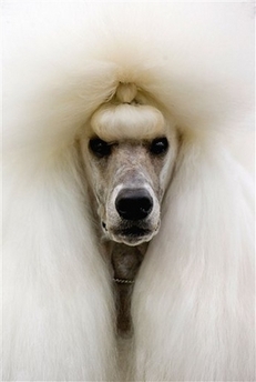 A Standard Poodle waits in backstage after being groomed prior to compete in the Mexico World Dog Show 2007 in Mexico City, Thursday May 24, 2007. Hundreds of dogs from different countries are entered for competition in the dog show in Mexico City.[AP]
