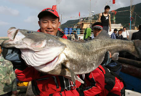 Wu Dengquan, member of a sea-angling club, shows a large jewfish he caught in the sea in Lianyungang, East China's Jiangsu Province, June 3, 2007. This 1.4-metre-long and 43-kilogram grouper set a record of the biggest fish cought by anglers in this city. [newsphoto]