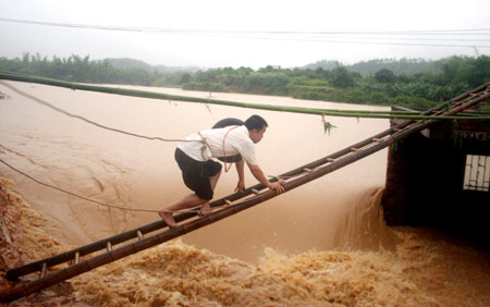 A man climbs a ladder to reach a drainage sluice station in Zi Jin