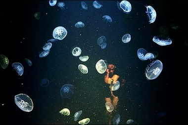 A tourist is reflected on a jelly fish water tank containing sea life of the mediterranean sea at Cretaquarium in the city of Irakleion on the island of Crete, southern Greece.[AFP]