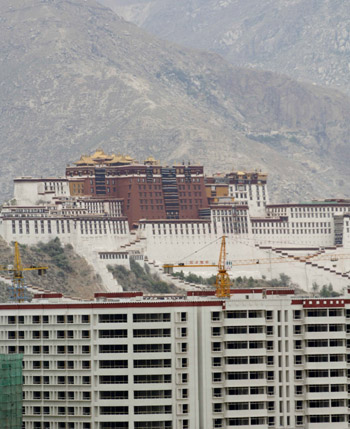 Apartment buildings are seen under construction near the Potala Palace in Lhasa, capital of Tibet Autonomous Region in Southwest China, in this photo taken on June 27, 2007. The Qinghai-Tibet Railway has boosted Tibet's development and the central government will further invest 77.8 billion yuan in infrastructures in this region before 2010. [Xinhua]