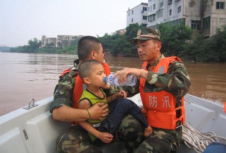 Chinese soldiers help a boy to drink after he was saved from the flood in Qu County, Southwest China's Sichuan Province, July 7, 2007. Floods and landslides triggered by heavy rains have killed at least 26 people and left 17 missing in southwest China's Sichuan Province since Monday night, the local government said on Saturday, Xinhua reported.