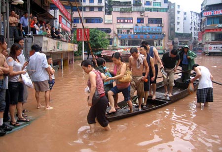 Residents pass through a flooded street on a boat in Qu County, Southwest China's Sichuan Province, July 7, 2007. Floods and landslides triggered by heavy rains have killed at least 26 people and left 17 missing in southwest China's Sichuan Province since Monday night, the local government said on Saturday, Xinhua reported.