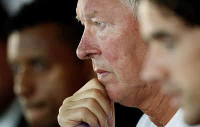 Manchester United manager Sir Alex Ferguson (C) sits between new signings Nani (L) of Portugal and Owen Hargreaves during a news conference at the club's Carrington training complex in Manchester, northern England, July 9, 2007. [Reuters]