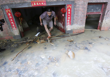 A man walks out from his house after a landslide triggered by heavy rains which hit the district in Southwest China's Chongqing Municipality July 9, 2007. Torrential rains battered large swathes of China on Monday after killing 94 people and displacing more than half a million over the past week, media said. [Reuters]