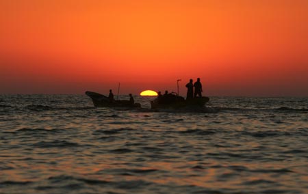 Palestinian fishermen fish in the Gaza sea July 10, 2007. [Reuters]