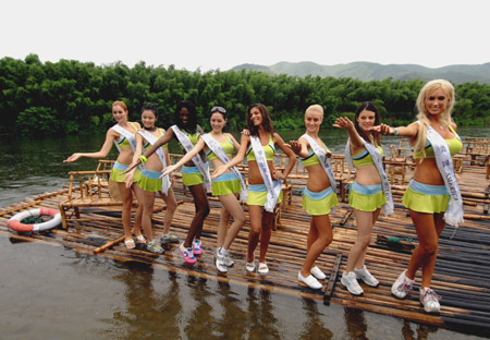 Contestants for Miss Tourism of The Globe 2007 pageant pose on a raft in Hangzhou, East China's Zhejiang Province, July 10, 2007. Contestants from more than 100 countries and regions gathered in China for the finals. [Xinhua]