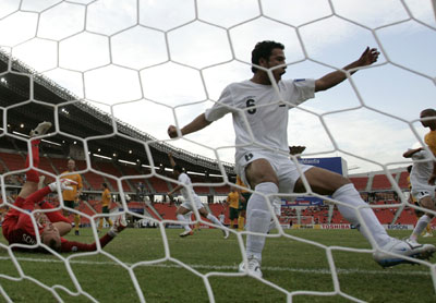 Iraq's Saleh Sadir (6) celebrates as teammate Nashat Akram (not pictured) scores past Australia's goal keeper Mark Schwarzer (L) from a free-kick during their AFC Asian Cup Group A match at Rajamangala Stadium in Bangkok July 13, 2007. [Reuters]