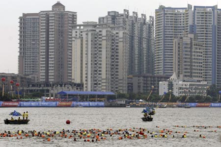 Participant swim across the Pearl River, China's third longest river, during an annual event in Guangzhou, South China's Guangdong Province July 15, 2007. Leaders of the southern Chinese city of Guangzhou led some 3700 residents in a "swimathon" across the Pearl River on Sunday to demonstrate the government's confidence over environment protection and pollution control. [Reuters]