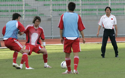 China's soccer coach Zhu Guanghu (R) watches his players during a training session for the 2007 AFC Asian Cup tournament in Kuala Lumpur July 14, 2007. [Reuters]