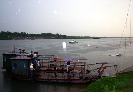 Rescuers hoist a bus which slipped off a ferry and sunk to the Xinjiang River out of the water in Yugan, South China's Jiangxi Province, July 16, 2007. Nine people have been confirmed dead in the accident, including two children and two women. [Xinhua]