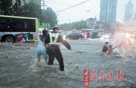 People are trapped in a flooded street as a heavy downpour hit Jinan, East China's Shandong Province, July 18, 2007. At least 22 people were killed in floods caused by the sudden storm which was the worst in the city's history. [qlwb.com.cn]