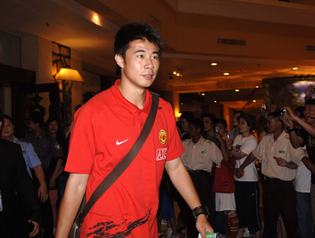 Manchester United player Dong Fangzhuo of China arrives at the hotel in Guangzhou, South China's Guangdong Province, July 25, 2007. Manchester United will play against a local soccer team on July 27 as part of their Asian tour. [Xinhua] |
