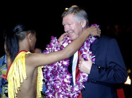 Manchester United coach Alex Ferguson is presented with a welcome wreath as he arrives at the hotel in Guangzhou, South China's Guangdong Province, July 25, 2007. Manchester United will play against a local soccer team on July 27 as part of their Asian tour. [Xinhua]