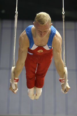A gymnast takes part in a training session ahead of the FIG 2007 World Cup Gymnastics in Shanghai July 26, 2007. [Reuters]