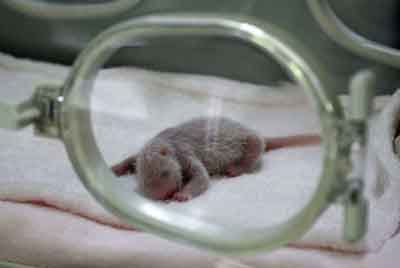 A newborn panda cub sleeps in an incubator at