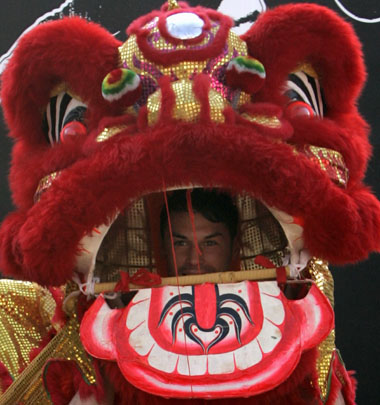 Chris Eagles of Manchester United performs a lion dance during a promotional event of the English soccer team in China's southern city of Guangzhou in Guangdong province July 26, 2007. Manchester United will play against Guangzhou Yi Yao on July 27 in Guangdong Olympic Stadium as the last match of their Asian tour. [Reuters] |