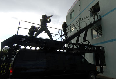 Armed policemen aim during an anti-terrorism drill in Haikou, South China's Haikou Province July 27, 2007. [Xinhua]