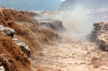 A general view of the torrential Hukou Waterfall on the Yellow River in Jixian County, North China's Shanxi Province, July 30, 2007. The width of Hukou, the world's only yellow waterfall, reached 100 meters after days of continuous rainfalls on the upper reaches of the Yellow River. [Xinhua]