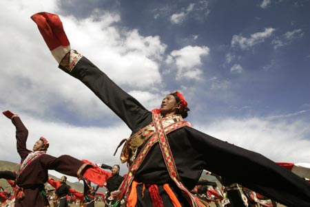 Tibetans perform a traditional dance during a cultural festival in Yushu, Northwest China's Qinghai Province July 27, 2007. The five-day arts festival includes folk performances, costume displays and horse racing, local media reported. [Reuters]
