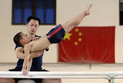 A gymnast from the Anhui provincial team practises with the help of his coach at a training center in Hefei, east China's Anhui province August 2, 2007. About 30 gymnasts, aged from 4 to 19, undergo training at the center, according to local media. [Reuters] |