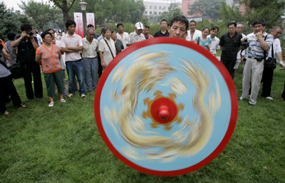 An elderly man spins a huge top to showcase Chinese traditional recreational games, or Doukongzhu, during activities to mark a one-year-countdown to the 2008 Olympic Games in Beijing, August 3, 2007. The Chinese capital is gearing up to celebrate the countdown to the opening ceremony of the next Olympic Games on August 8, 2008. [Reuters]