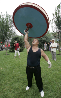 An man spins a huge top to showcase Chinese traditional recreational games, or Doukongzhu, during activities to mark a one-year-countdown to the 2008 Olympic Games in Beijing, August 3, 2007. The Chinese capital is gearing up to celebrate the one-year countdown to the opening ceremony of the 2008 Olympic Games on August 8. [Reuters]