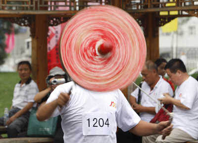 An elderly man spins a huge top to showcase Chinese traditional recreational games,or Doukongzhu, during activities to mark a one-year-countdown to the 2008 Olympic Games in Beijing, August 3, 2007. The Chinese capital is gearing up to celebrate the countdown to the opening ceremony of the next Olympic Games on August 8, 2008. [Reuters]