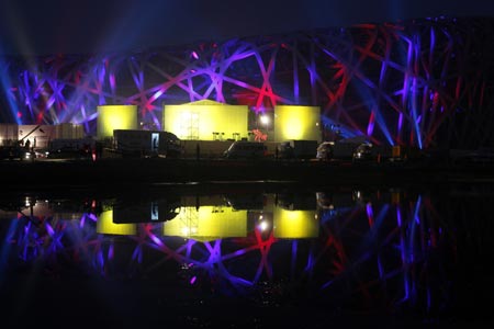 A general view shows the National Olympic Stadium, also known as the Bird's Nest, as it is lit up by coloured lights during activities to mark a one year countdown to the 2008 Olympic Games at night in Beijing August 5, 2007. The Chinese capital is gearing up to celebrate the one year countdown to the opening ceremony of the 2008 Olympic Games on August 8.[Reuters]