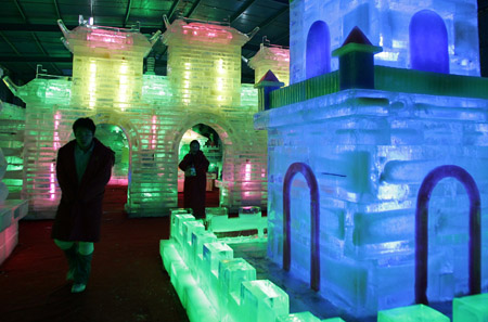 People visit an indoor ice sculpture exhibition in Wuhan, Central China's Hubei Province, August 5, 2007. The show was a place for citizens to escape the summer heat, as the city is dubbed one of China's "four furnaces". But the exchibition also sparked criticism for consuming a lot of energy in the midst of a short power supply during the scorching weather. [newsphoto]