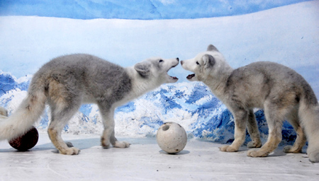 Two Arctic foxes (Alopex lagopus) make their debut at the Polar Aquarium in Harbin, Northeast China's Heilongjiang Province, August 7, 2007. [Xinhua]