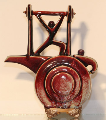 A ceramic teapot featuring a weight-lifting design is on display in Yuzhou, Central China's Henan Province, August 7, 2007. Artisan He Wenqi designed and produced the set of wares to commemorate the upcoming Beijing Olympic Games next year. [newsphoto]