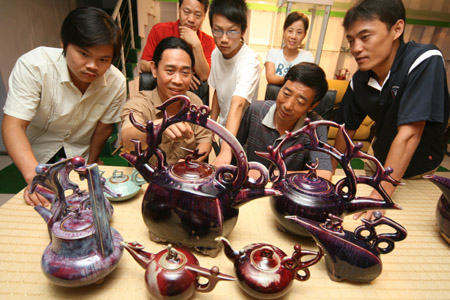 Visitors watch teapots featuring sports designs in Yuzhou, Central China's Henan Province, August 7, 2007. Artisan He Wenqi designed and produced the set of wares to commemorate the upcoming Beijing Olympic Games next year. [newsphoto]