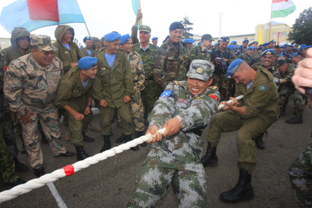 Soldiers from the six members of the Shanghai Cooperation Organization compete in a tug-of-war match during a get-together before the "Peace Mission 2007" counter-terrorism drill in Chelyabinsk, Russia, August 8, 2007. The joint military drill will begin on Thursday and run until August 17. [Xinhua] |
