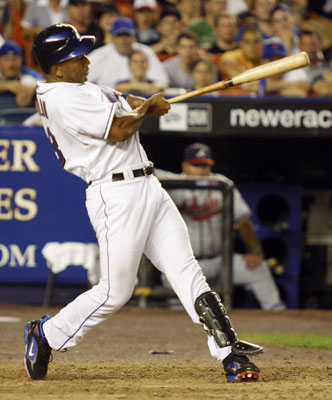New York Mets batter Moises Alou hits a solo home run against the Atlanta Braves in the eighth inning of their National League baseball game in New York August 8, 2007. [Reuters]