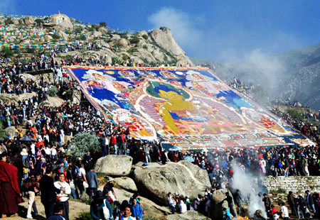 A 35-meter by 30-meter Thangka painting bearing the image of Sakyamuni, founder of Buddhism, is unveiled August 12, 2007 on the hillside next to the Zhebung Monastery in Lhasa, capital of China's Tibet Autonomous Region. The occasion marks the beginning of the annual Shoton (Yogurt Banquet) Festival that is believed to date back to the 11th century. Originally a religious activity for pilgrims to serve yogurt to monks and nuns finishing their summer retreat, the festival has become a theatrical event since the mid-17th century. The week-long festival features Tibetan opera performances and yak races. [Xinhua] |