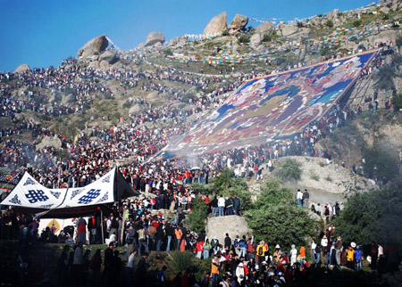 A 35-meter by 30-meter Thangka painting bearing the image of Sakyamuni, founder of Buddhism, is unveiled August 12, 2007 on the hillside next to the Zhebung Monastery in Lhasa, capital of China's Tibet Autonomous Region. The occasion marks the beginning of the annual Shoton (Yogurt Banquet) Festival that is believed to date back to the 11th century. Originally a religious activity for pilgrims to serve yogurt to monks and nuns finishing their summer retreat, the festival has become a theatrical event since the mid-17th century. The week-long festival features Tibetan opera performances and yak races. [Xinhua] |