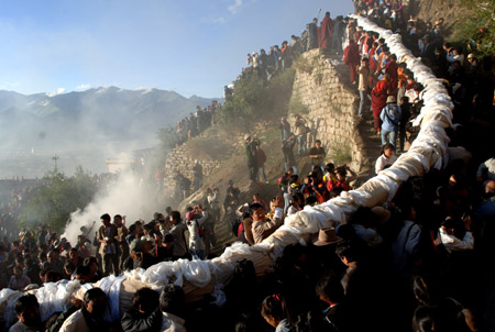 Buddhist monks and pilgrims carry a 35-meter by 30-meter Thangka painting bearing the image of Sakyamuni, founder of Buddhism, druing the unveiling ceremony on the hillside next to the Zhebung Monastery in Lhasa, capital of the Tibet Autonomous Region, August 12, 2007. The occasion marks the beginning of the annual Shoton (Yogurt Banquet) Festival that is believed to date back to the 11th century. Originally a religious activity for pilgrims to serve yogurt to monks and nuns finishing their summer retreat, the festival has become a theatrical event since the mid-17th century. The week-long festival features Tibetan opera performances and yak races.[Shanghai Daily]