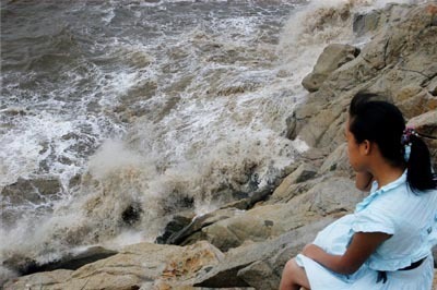 A woman watches huge tidal waves by sitting on the seaside rocks in Lianyungang, a port city in east China's Jiangsu Province on August 12, 2007. Strong winds, brought by tropical storm Wutip, hit the sea coast, prompting 20-meter-high water columns, which attracted and stunned a great many tourists. [newsphoto]