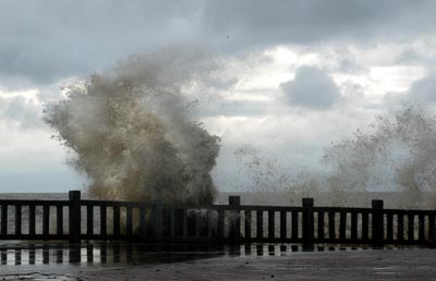 Surging tidal waves caused by strong winds of up to 7-8 grade hit the sea coast and patter the balusters of a nearby square in Lianyungang, a port city in east China's Jiangsu Province on August 12, 2007. Water columns as high as 20 meters attracted and stunned a great many visitors. [newsphoto]