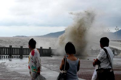 Local residents watch huge tidal waves which hit the sea coast in Lianyungang, a port city in east China's Jiangsu Province on August 12, 2007. Strong winds, brought by tropical storm Wutip, hit the sea coast, driving 20-meter-high water columns, which attracted and stunned a great many tourists. [newsphoto]