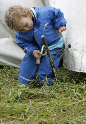 A child hits in a tent peg at the camp for Climate Action on the site of the proposed expansion for Heathrow Airport at Sipson near London August 14, 2007. Hundreds of climate demonstrators set up a tent camp next to London's Heathrow airport on Monday and threatened "direct action" at the world's busiest air hub to protest against global warming. [Reuters]